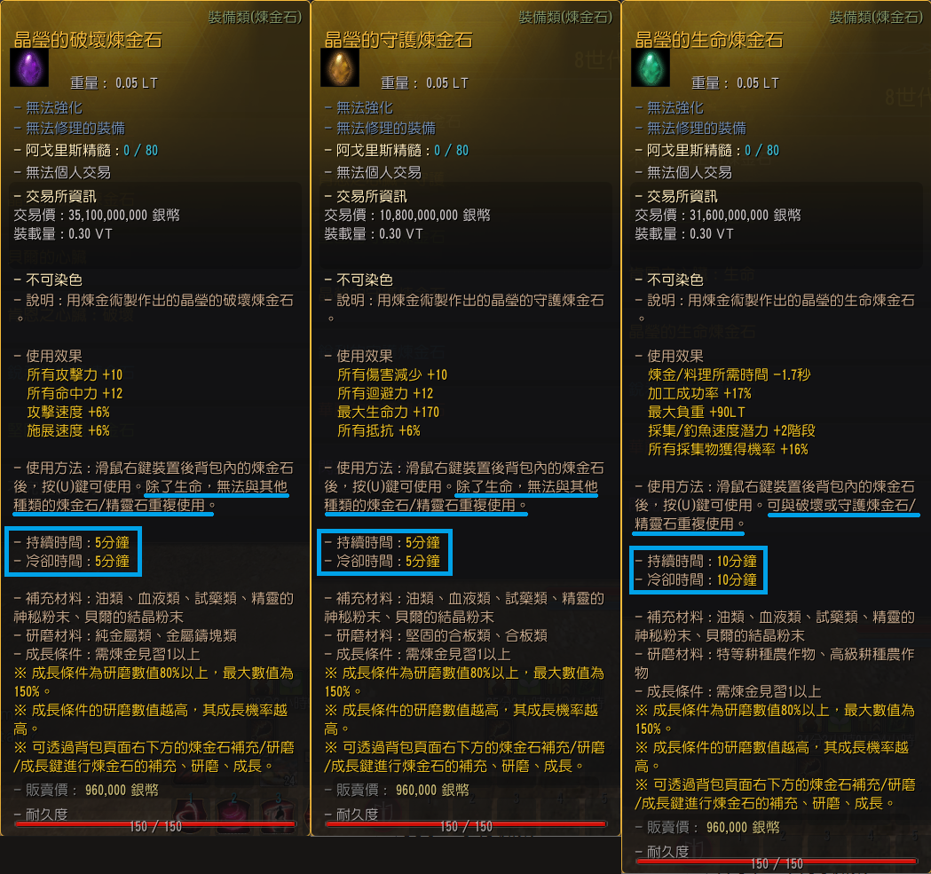 生命煉金石的增益狀態是10分鐘,冷卻時間10分鐘,可以和攻擊煉金石或防禦煉金石的增益狀態同時存在 (參考上圖)煉金石可以成長、改良、結合/分解、恢復耐久度。精靈石則是和煉金石完全一樣功能的物品。兩者的差別在於: 精靈石不可成長、不可改良、不可結合/分解、不可恢復耐久度。用完耐久度之後只能丟掉或者磨成粉末